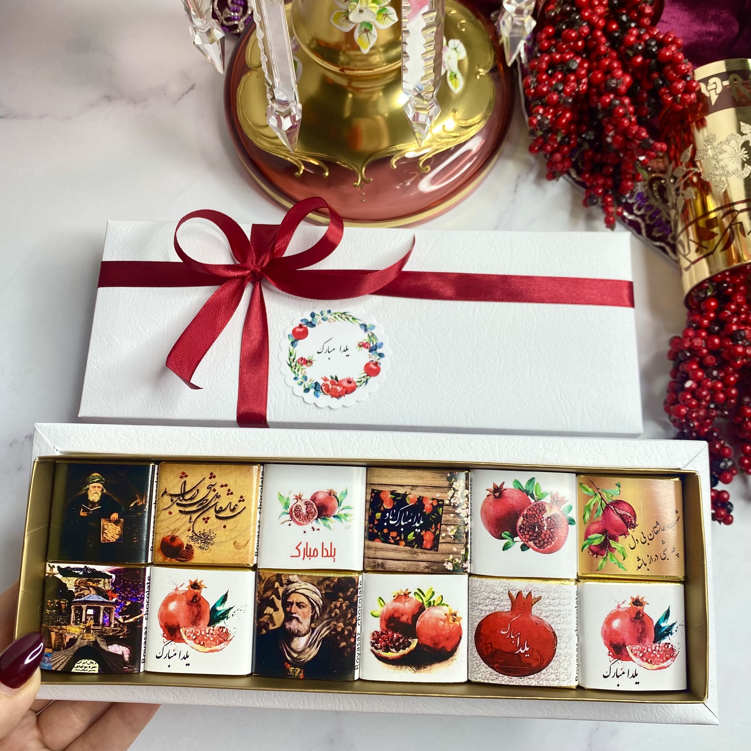 باکس شکلات با طراحی چاپی ویژه شب یلدا و اشعار حافظ، قابل سفارش در تعدادهای مختلف. مناسب برای هدیههای سازمانی، گیفت شب یلدا، یا پذیراییهای خاص و لاکچری.