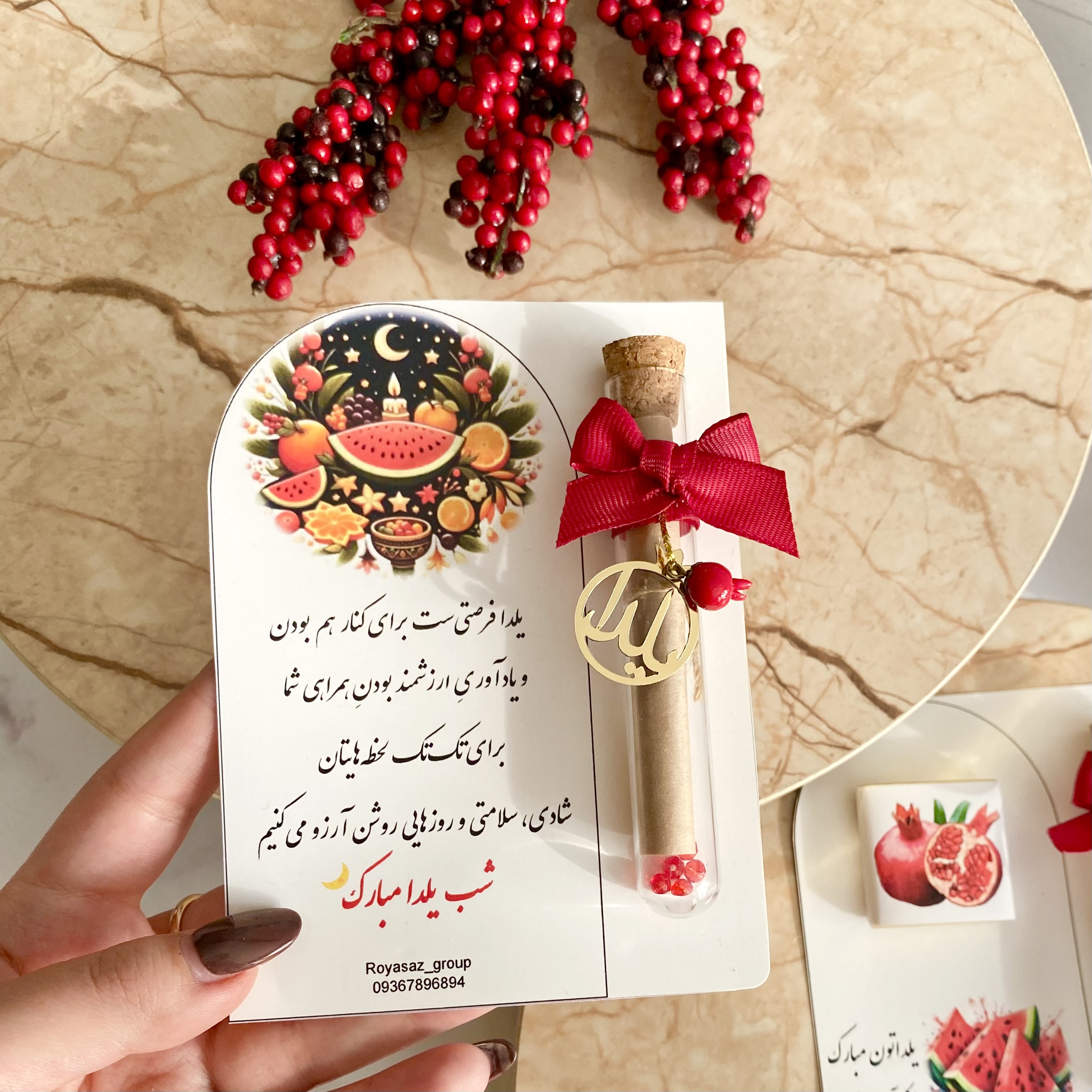 داخل بطری فال به صورت رندوم و غیر تکراری وجود دارد. روی بطری ها برای داشتن نمادی از شب یلدا ، تگ یلدا یا انار یا دونه انار بنا به موجودی مواد اولیه قرار میگیرد